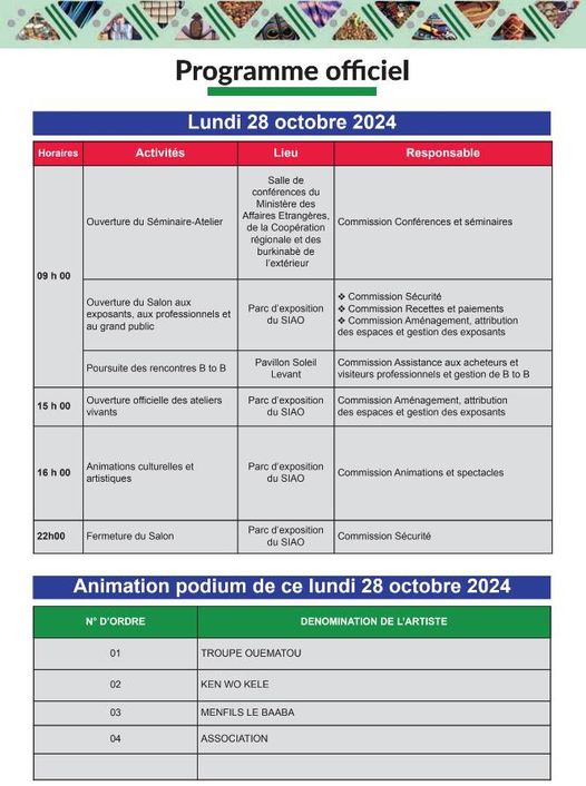 Ci-dessous le programme du Salon International de l'Artisanat de Ouagadougou (SIAO), du lundi 28 octobre 2024.