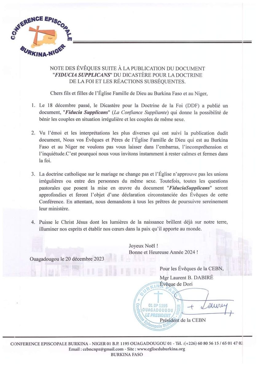 Ceci est une déclaration de la conférence épiscopale Burkina Niger, en lien avec la bénédiction des couples homosexuels et les copules en situation irrégulière.