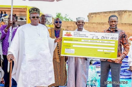 D’un montant total de 26 millions 258 mille 500 (26 258 500) FCFA, le don est composé d’un chèque d’un montant de treize millions (13 000 000) de FCFA, de dix (10) tonnes de riz, de vingt (20) cartons d’huile, de dix (10) sacs de sel, de cent (100) nattes, de cinq (05) cartons d’huile à moteur et d’un (01) forage de 22 m3 équipé.