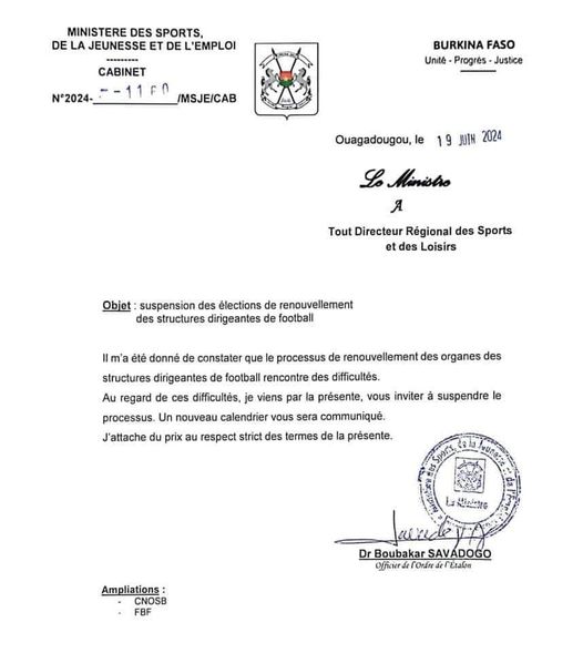 "Il m'a été donné de constater que le processus de renouvellement des organes des structures dirigeantes de football rencontre des difficultés.