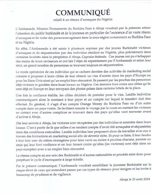 Ceci est un communiqué de l'Ambassade, Mission permanente du Burkina Faso à Abuja au Nigéria, relatif à l'existence d'un réseau d'arnaque dont des Burkinabè font partie des nombreuses victimes, informe le ministère en charge des affaires étrangères, sur la page face book du mercredi 28 août 2024.