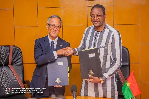 SEM Karamoko Jean Marie TRAORE, ministre des Affaires étrangères de la Coopération régionale et des Burkinabè de l'Extérieur, et l'Ambassadeur du Japon au Burkina Son Excellence Monsieur Jun NAGASHIMA, ont procédé ce jeudi 10 octobre 2024, à la signature et à l'échange de Notes, pour l'exécution de l'aide alimentaire K-R 2024 du gouvernement japonais au profit du Burkina Faso.