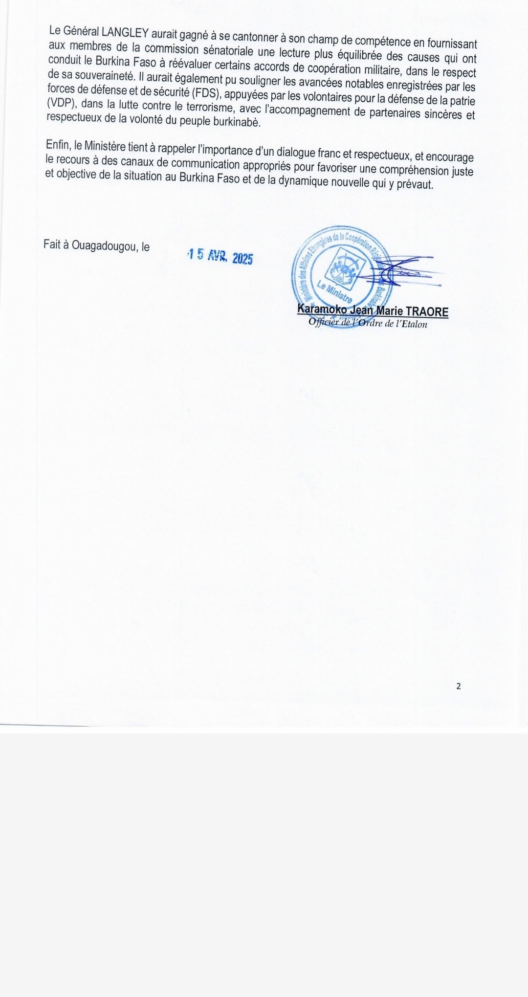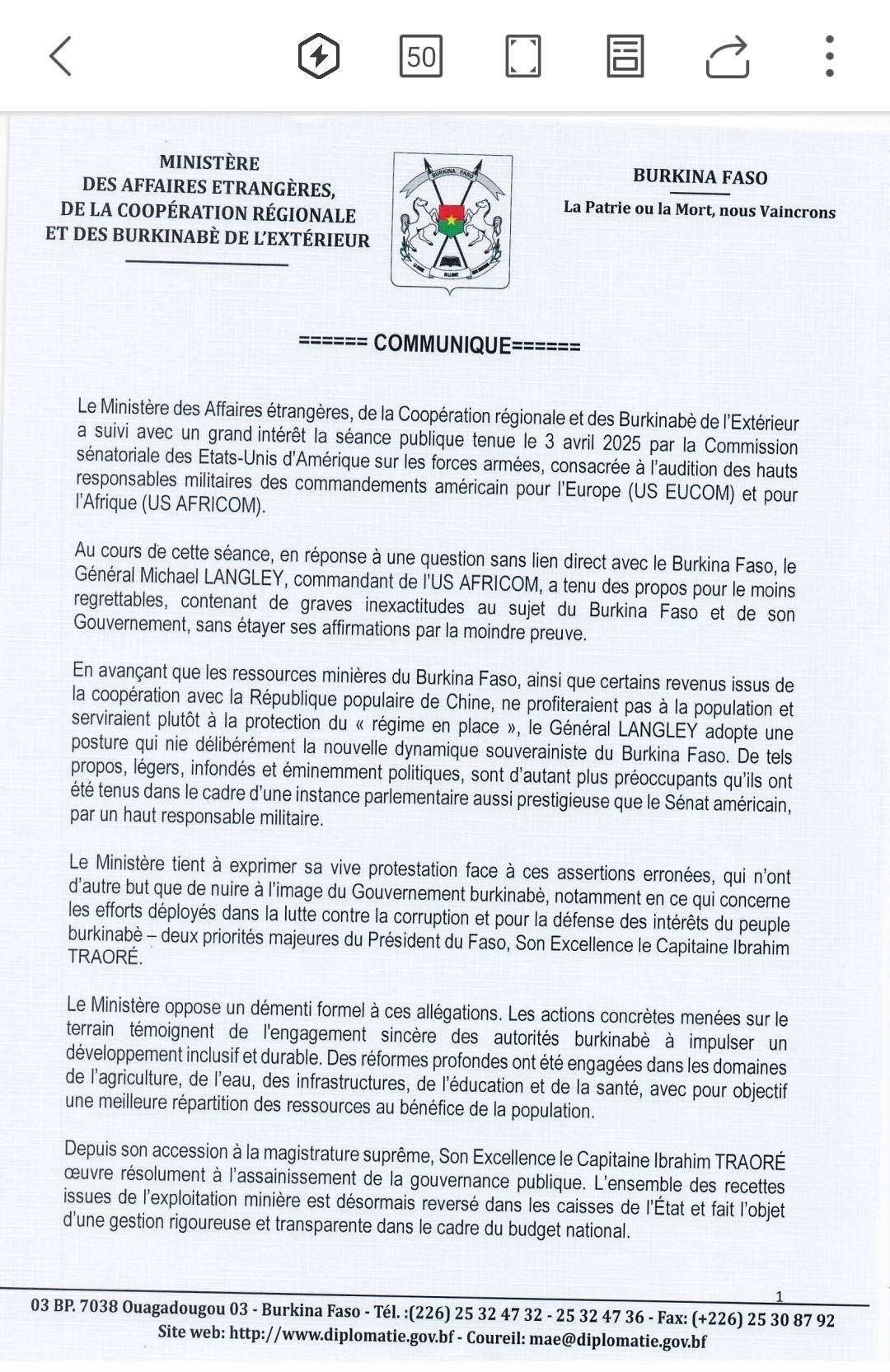 Ceci est un communiqué du ministère des Affaires étrangères de la Coopération régionale et de la Coopération régionale, suite aux propos inexacts sur le Burkina Faso et son gouvernement, prononcés par le Général Michael LANGLEY, commandant de l'US AFRICOM, lors d'une séance d'audition organisée par la commission sénatoriale des États Unis d'Amérique.
