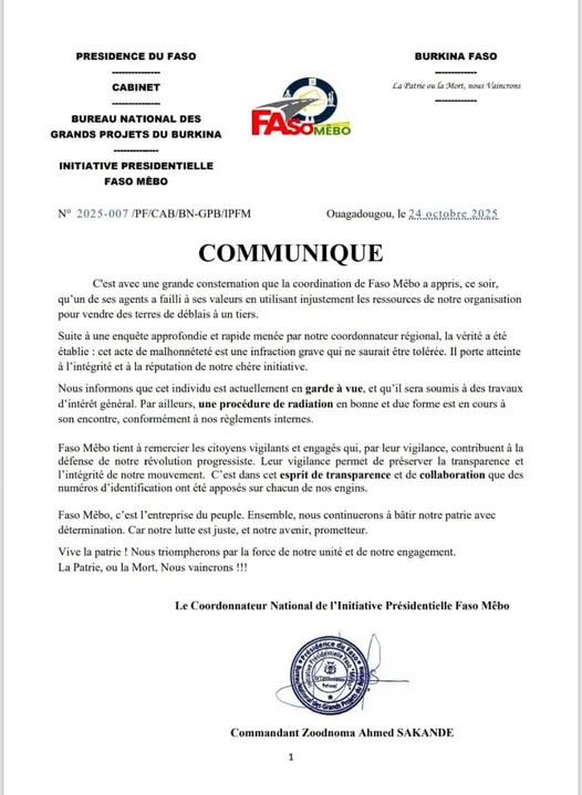 L’Initiative présidentielle Faso Mêbo a annoncé, dans un communiqué publié vendredi soir, la radiation en cours d’un de ses agents. Ce dernier est accusé d’avoir illégalement vendu des terres de déblais appartenant à la structure à une tierce personne.