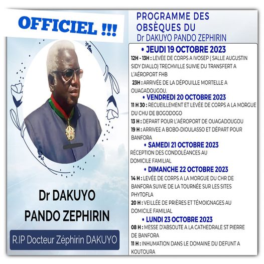 Ci dessous le programme des obsèques du Pr Dakuyo Zéphirin, décès survenu le dimanche 15 octobre 2023, à Abidjan en Côte d'Ivoire .