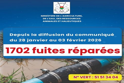 Suite au communiqué du Ministère de l’Agriculture, de l’Eau, des Ressources animales et halieutiques invitant les populations à contacter le numéro vert 𝟱𝟭 𝟱𝟭 𝟯𝟰 𝟬𝟰 pour signaler les fuites d’eau lorsqu’aucune intervention n’est effectuée dans un délai de trois heures après avoir saisi le numéro vert de l’Office National de l’Eau et de l’Assainissement (ONEA), 𝟭 𝟳𝟬𝟮 𝗳𝘂𝗶𝘁𝗲𝘀 𝗼𝗻𝘁 𝗲́𝘁𝗲́ 𝗿𝗲́𝗽𝗮𝗿𝗲́𝗲𝘀 𝗲𝗻𝘁𝗿𝗲 𝗹𝗲 𝟮𝟴 𝗷𝗮𝗻𝘃𝗶𝗲𝗿 𝗲𝘁 𝗹𝗲 𝟯 𝗳𝗲́𝘃𝗿𝗶𝗲𝗿 𝟮𝟬𝟮𝟲. Le Ministère salue l’esprit de patriotisme et de civisme des populations, qui n’ont ménagé aucun effort pour signaler les cas de fuites. Il les invite à poursuivre cette dynamique afin de contribuer à la préservation de l’eau, ressource précieuse et vitale.