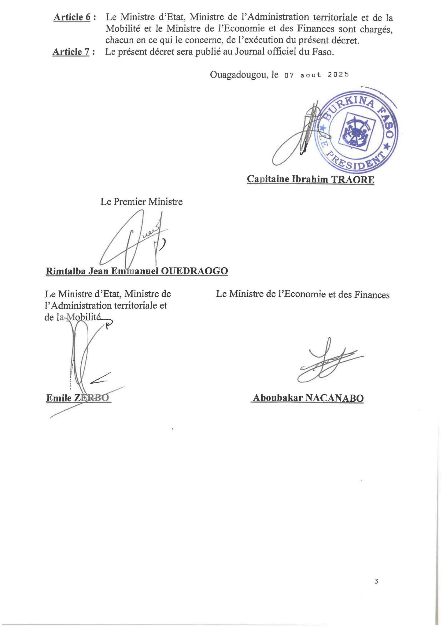 Le Président du Faso, Chef de l’État et Président du Conseil des ministres, a signé le décret N°2025-1003/PF/PRIM/MATM/MEF portant changement de dénominations des provinces et des régions en tant que circonscriptions administratives.